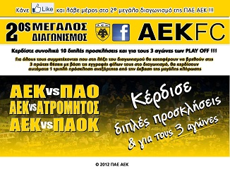 Η σελίδα AEK FC / ΠΑΕ ΑΕΚ στο facebook διοργανώνει διαγωνισμούς και σας δίνει τη δυνατότητα να κερδίσετε 10 διπλές προσκλήσεις για τους αγώνες των PLAY OFF, ΑΕΚ-ΠΑΟ, ΑΕΚ-ΑΤΡΟΜΗΤΟΣ και ΑΕΚ-ΠΑΟΚ.
