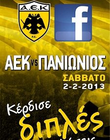 Η σελίδα AEK FC διοργανώνει διαγωνισμό και σας δίνει τη δυνατότητα να κερδίσετε 5 διπλές προσκλήσεις για τον εντός έδρας αγώνα που θα διεξαχθεί το Σάββατο 2/2/2013 ΑΕΚ – ΠΑΝΙΩΝΙΟΣ.