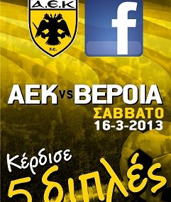 Η σελίδα AEK FC διοργανώνει διαγωνισμό και σας δίνει τη δυνατότητα να κερδίσετε 5 διπλές προσκλήσεις για τον εντός έδρας αγώνα που θα διεξαχθεί το Σάββατο, 16/03/2013 ΑΕΚ – ΒΕΡΟΙΑ.