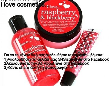 Το S4SisterStyle κάνει δώρο σε ένα τυχερό ένα υπέροχο πακέτο προϊόντων από την All about Eve. Συγκεκριμένα το πακέτο περιλαμβάνει αφρόλουτρο 100ml Rasberry & Blackberry , body butter 100ml Rasberry & blackberry και lip gloss 15ml Rasberry & blackberry.