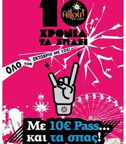 Το cheapis.gr σας προσφέρει ένα Allou! Day Pass, ημερήσιο πάσο διασκέδασης μαζί με 1 μάρκα για τα συγκρουόμενα και το συλλεκτικό ημερολόγιο Allou! 2013 με 12 Έλληνες celebrities για την ενίσχυση του συλλόγου φίλων παιδιών με καρκίνο «ΕΛΠΙΔΑ» με 10€ (αξίας 20€ – έκπτωση 50%)!