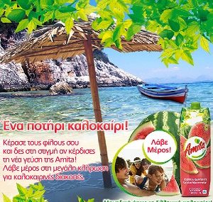 Η Amita διοργανώνει διαγωνισμό και δίνει τη δυνατότητα σε 50 τυχερούς να κερδίσουν από ένα κιβώτιο Amita Κοκτέιλ Καρπούζι (το κάθε κιβώτιο περιέχει 12 συσκευασίες 1LT) και σε ένα μεγάλο νικητή να κερδίσει 2 διανυκτερεύσεις για 2 άτομα ή για τετραμελή οικογένεια σε ένα Grecotel της επιλογής του.