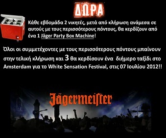 H σελίδα Jagermeister Greece διοργανώνει διαγωνισμό και δίνει τη δυνατότητα σε 3 τυχερούς να κερδίσουν από ένα ταξίδι στο Amsterdam για να συμμετάσχουν στο White Sensation Festival στο Amsterdam Arena στις 7 Ιουλίου και ένα Jager Party Box Machine κάθε εβδομάδα.