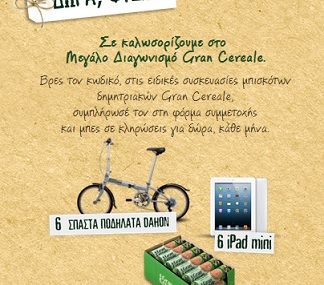 Η σελίδα Grancereale Greece διοργανώνει διαγωνισμό και σας δίνει τη δυνατότητα να κερδίστε πλούσια δώρα: κάθε εβδομάδα ένας τυχερός κερδίζει ένα κιβώτιο μπισκότων Grancereale. Kάθε 15 του μήνα ένας τυχερός κερδίζει ένα ποδήλατο Dahon. Kάθε τέλος του μήνα, ένας τυχερός κερδίζει ένα Apple iPad Mini Wifi 16GB.