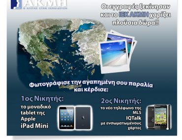 Το ΙΕΚ Ακμή διοργανώνει διαγωνισμό και σας δίνει τη δυνατότητα να κερδίσετε ένα tablet της Apple iPad mini. Ο δεύτερος νικητής κερδίζει ένα κινητό τηλέφωνο IQTalk της MLS!