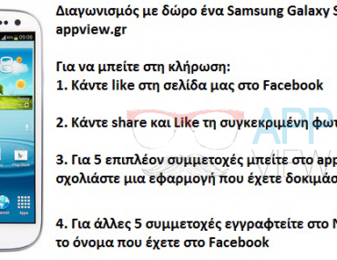 Το Appview.gr διοργανώνει διαγωνισμό και σας δίνει τη δυνατότητα να κερδίσετε ένα Samsung Galaxy S3 3G 16GB το οποίο είναι εξοπλισμένο με κορυφαία τεχνικά χαρακτηριστικά, λεπτό, με μεγάλη οθόνη, τετραπύρηνο επεξεργαστή και λειτουργικό Android!