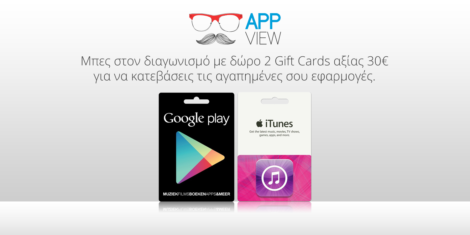 Μεγάλος διαγωνισμός του Appview.gr με δώρο 1 Gift Card για iTunes και 1 Gift Card για Google Play, αξίας 15 ευρώ η κάθε μία,με σκοπό να σας φέρει πιο κοντά στις εφαρμογές.