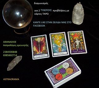 Το astraorama.gr διοργανώνει διαγωνισμoύς και δίνει τη δυνατότητα σε 2 τυχερούς να κερδίσουν μια πρόβλεψη με κάρτες ΤΑΡΩ και σε ακόμα 2 να κερδίσουν προσωπικά ωροσκόπια με ανάλυση του 2012.