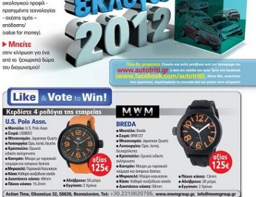 Η σελίδα autotriti σας καλεί στις auto εκλογές 2012 να ψηφίστε τα καλύτερα αυτοκίνητα ανά κατηγορία, να αναδείξτε τις τάσεις της Ελληνικής αγοράς και να διεκδικήστε 2 ρολόγια U.S. Polo Assn. της MWM Group, 2 ρολόγια Breda της MWM Group και 4 αντικλεπτικά αυτοκινήτων Bear Lock.