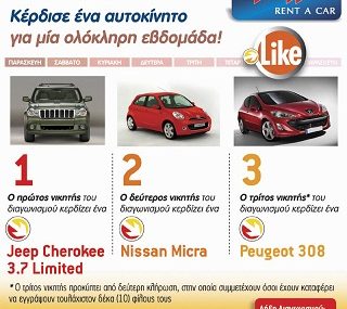 Η σελίδα Avance Greece διοργανώνει διαγωνισμό και σας δίνει τη δυνατότητα να κερδίσετε για μια εβδομάδα, ένα Jeep Cherokee 3.7 Limited (1ος νικητής), ένα Nissan Micra (2ος νικητής) και ένα Peugeot 308 (3ος νικητής).