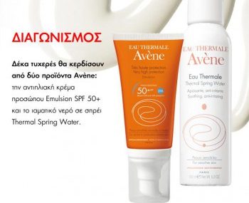 Το elle.gr διοργανώνει διαγωνισμό και σας δίνει τη δυνατότητα να κερδίσετε 10 σετ Avene. To κάθε σετ αποτελείται από 2 προϊόντα: αντηλιακή κρέμα Emulsion SPF 50+ σε συσκευασία των 40ml και ιαματικό νερό σε σπρέι Thermal Spring Water σε συσκευασία των 150ml.