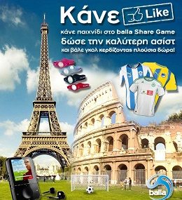 Το Balla.com.cy σας προσκαλεί να κάνετε παιχνίδι με την εφαρμογή balla share game και κάθε δεύτερη Παρασκευή με πρώτη την Παρασκευή 9 Μαρτίου και ώρα 13:30 θα πραγματοποιείται δεκαπενθήμερη κλήρωση της οποίας τα δώρα για πέντε τυχερούς θα είναι: Φανέλες των αγαπημένων σας ομάδων, αθλητικά ρολόγια, Δωρεάν γήπεδα 7×7 στη Λευκωσία για εσάς και τους φίλους σας, εισιτήρια για το πρωτάθλημα Marfin, γεύματα σε εστιατόρια σε Λευκωσία, Λεμεσό και Λάρνακα, mp3, αθλητικά ενεργειακά βραχιόλια και άλλα ισάξιας αξίας. Την τελευταία Παρασκευή του Απριλίου και του Μαΐου και ώρα 14:30 θα πραγματοποιείται μηνιαία κλήρωση με μεγάλο δώρο ένα ταξίδι στο Παρίσι ή στη Ρώμη για δύο άτομα.