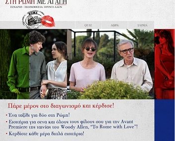 Η σελίδα Barilla Greece διοργανώνει διαγωνισμό και σας δίνει τη δυνατότητα να κερδίσετε ένα ταξίδι για δυο στη Ρώμη, εισιτήρια για εσάς και όλους τους φίλους σας για την Avant Premiere της ταινίας του Woody Allen “To Rome with Love” και διπλά εισιτήρια για τις καθημερινές προβολές της ταινίας.