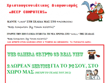 Το Beep Computers διοργανώνει Χριστουγεννιάτικο διαγωνισμό και δίνει τη δυνατότητα σε 1 τυχερό να κερδίσει τη «WEB ΚΑΜΕΡΑ CRYPTO 3D REAL VIEW» και σε άλλους 2 τυχερούς να κερδίσουν από ένα service για το pc τους, έως το τέλος του 2012.