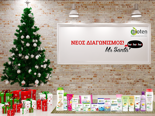 Η bioten διοργανώνει το διαγωνισμό Mr Santa Ho(t) Ho(t) Ho(t) και δίνει τη δυνατότητα σε ένα τυχερό να κερδίσει προϊόντα bioten για 1 χρόνο τα οποία θα τα παραδώσει ένας πραγματικός hot Santa και σε 14 ακόμα τυχερούς να κερδίσουν από ένα σετ με προϊόντα bioten.