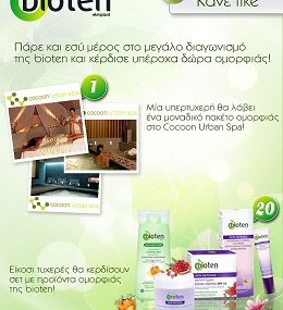 Η σελίδα bioten διοργανώνει διαγωνισμό και δίνει τη δυνατότητα σε ένα νικητή να κερδίσει ένα πακέτο ομορφιάς από το Cocoon Urban Spa και θα περιλαμβάνει: Μία περιποίηση προσώπου διάρκειας 45’, ένα μασάζ σώματος διάρκειας 55’, Jacuzzi, Σάουνα ή Χαμάμ. Οι επόμενοι 20 νικητές, θα λάβουν από ένα σετ προϊόντων το οποίο θα αποτελείται από: 1 αντιρυτιδική κρέμα ημέρας SKIN DEFENCE (για κανονικό/μικτό ή για ξηρό/ευαίσθητο), 1 γαλάκτωμα καθαρισμού προσώπου SKIN MOISTURE (για κανονικό/μικτό ή για ξηρό/ευαίσθητο) και 1 Αντιρυτιδική & Συσφικτική Κρέμα Ματιών SKIN DEFENCE (για όλους τους τύπους δέρματος).