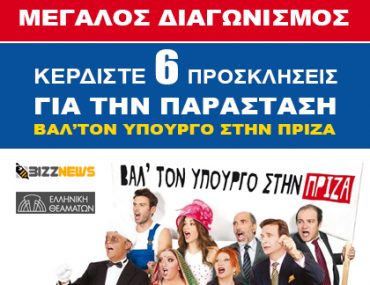 Το Bizznews.gr σε συνεργασία με την Ελληνική Θεαμάτων, δίνει τη δυνατότητα σε έξι τυχερούς αναγνώστες/ αναγνώστριες, να παρακολουθήσουν από κοντά την παράσταση “Βαλ’ τον υπουργό στην πρίζα”.