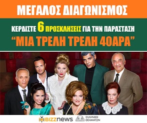 Το Bizznews.gr σε συνεργασία με την Ελληνική Θεαμάτων, δίνει τη δυνατότητα σε έξι τυχερούς αναγνώστες/ αναγνώστριες, να παρακολουθήσουν από κοντά την παράσταση “Μια τρελή τρελή σαραντάρα”.