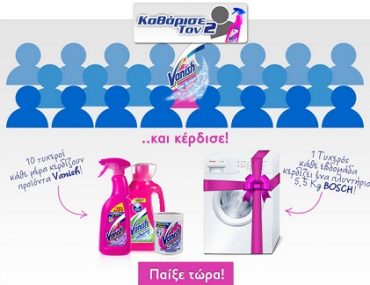 Η σελίδα Vanish Greece διοργανώνει διαγωνισμό και δίνει τη δυνατότητα σε 10 τυχερούς κάθε μέρα να κερδίσουν προϊόντα Vanish (1 Vanish Power White Σκόνη 500gr, 1 Vanish Oxi Action Spray 500mL και 1 Vanish Extra Hygiene Gel 940mL) και σε ένα μεγάλο τυχερό κάθε εβδομάδα να κερδίσει ένα πλυντήριο ρούχων Bosch 5,5 kg.