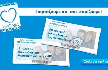Τα Carrefour Μαρινόπουλος διοργανώνουν διαγωνισμό και δίνουν τη δυνατότητα σε 1 μεγάλο τυχερό στο τέλος του διαγωνισμού να κερδίσει 5 δωροεπιταγές των 50€ (250€ σύνολο) και σε 50 instant νικητές να κερδίσουν από μία δωροεπιταγή αξίας 50€.