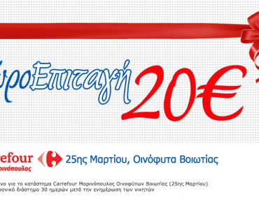 Η σελίδα Carrefour Mαρινόπουλος Οινόφυτα διοργανώνει διαγωνισμό και σας δίνει τη δυνατότητα να κερδίσετε 50 δωροεπιταγές αξίας 20€!