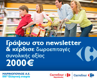 Η Carrefour δίνει την δυνατότητα στους επισκέπτες να εγγραφούν στο Newsletter και στην συνέχεια να κερδίσουν μια συμμετοχή στον διαγωνισμό για περισσότερες από 50 δωροεπιταγές αξίας 2000 ευρώ!