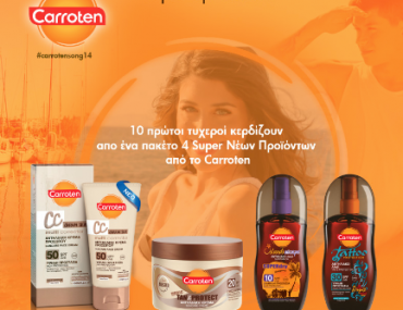 Το Carroten διοργανώνει διαγωνισμό και δίνει τη δυνατότητα σε 10 τυχερούς να κερδίσουν από ένα σετ με 4 νέα προϊόντα: μία αντηλιακή κρέμα προσώπου Carroten CC Dream Skin Multi Corrector SPF 50, μία αντηλιακή κρέμα Magic Tan & Protect Cream SPF 20, ένα αντηλιακό λάδι Carroten Islands Escape SPF 10 και ένα αντηλιακό λάδι Carroten Tattoo Protection SPF 30.