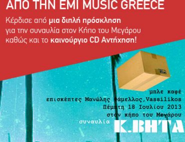 Η EMI Music Greece διοργανώνει διαγωνισμό και σας δίνει τη δυνατότητα να κερδίσετε από μια διπλή πρόσκληση για την συναυλία του Κ.ΒΗΤΑ στον Κήπο του Μεγάρου καθώς και το καινούργιο CD του Κωνσταντίνου – Αντήχηση.