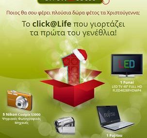 Το Click@Life διοργανώνει το μεγάλο διαγωνισμό click&win με δώρα 1 τηλεόραση Funai LED TV 40” FULL HD, 1 Fujitsu amilo notebook series Pi 3560, 1 Sony βιντεοκάμερα DCR- DVD 510 και 5 Nikon Coolplx S3000 ψηφιακές φωτογραφικές μηχανές.
