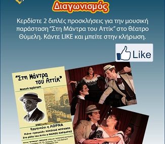 Το DailyGoal.gr και το θέατρο ΘΥΜΕΛΗ προσφέρουν σε 2 τυχερούς μία διπλή πρόσκληση για την παράσταση “Στη Μάντρα του Αττίκ”. Η παράσταση είναι την Δευτέρα 26 Νοεμβρίου.