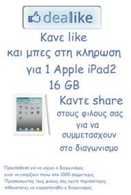 Το Dealike.gr διοργανώνει διαγωνισμό στο facebook και σας δίνει τη δυνατότητα να κερδίσετε ένα 1 Apple iPad2 Wi-Fi 16 GB.