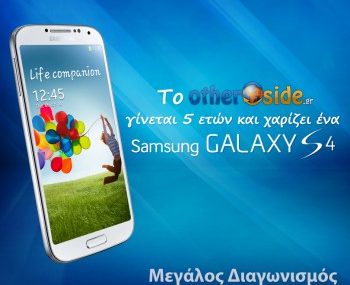 Το Otherside.gr κλείνει τα 5 χρόνια λειτουργίας του στις 16 Ιουλίου και γιορτάζει με έναν μεγάλο διαγωνισμό! Ένας τυχερός θα κερδίσει το κορυφαίο κινητό τηλέφωνο Samsung Galaxy S4, αξίας 729 ευρώ.