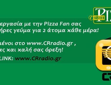 Την Τρίτη 15 Ιουλίου το www.CRradio.gr θα κληρώσει σε ένα τυχερό ή μία τυχερή από ένα γεύμα για 2 άτομα προσφορά από την Pizza Fan. Το γεύμα περιλαμβάνει δύο (2) πίτσες των 8 τεμαχίων και ένα Choco KRATS ή μία Μπουγάτσα KRATS.