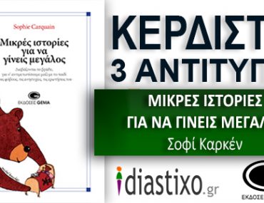 Το diastixo.gr σε συνεργασία με τις εκδόσεις Gema, προσφέρει στους αναγνώστες του 3 αντίτυπα από το βιβλίο της Σοφί Καρκέν, ΜΙΚΡΕΣ ΙΣΤΟΡΙΕΣ ΓΙΑ ΝΑ ΓΙΝΕΙΣ ΜΕΓΑΛΟΣ.