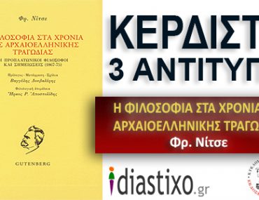 Το diastixo.gr σε συνεργασία με τις εκδόσεις Gutenberg, προσφέρει στους αναγνώστες του 3 αντίτυπα από το βιβλίο του Φρειδερίκου Νίτσε Η ΦΙΛΟΣΟΦΙΑ ΣΤΑ ΧΡΟΝΙΑ ΤΗΣ ΑΡΧΑΙΟΕΛΛΗΝΙΚΗΣ ΤΡΑΓΩΔΙΑΣ.