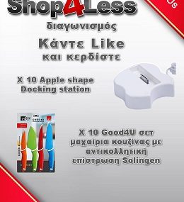 Το Shop4less διοργανώνει διαγωνισμό και σας δίνει τη δυνατότητα να κερδίσετε 10 Apple shape Docking station και 10 Good4U σετ μαχαίρια κουζίνας με αντικολλητική επίστρωση Solingen.