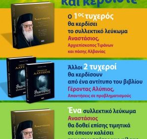 Οι Eκδόσεις Επτάλοφος διοργανώνουν διαγωνισμό και σας δίνουν τη δυνατότητα να κερδίσετε 3 βιβλία, ένα συλλεκτικό λεύκωμα «Αναστάσιος» και 2 αντίτυπα του βιβλίου «Γέροντας Αλύπιος».