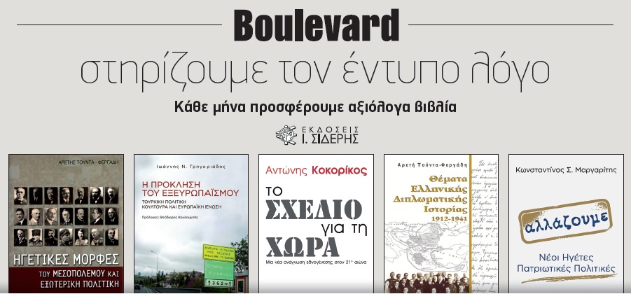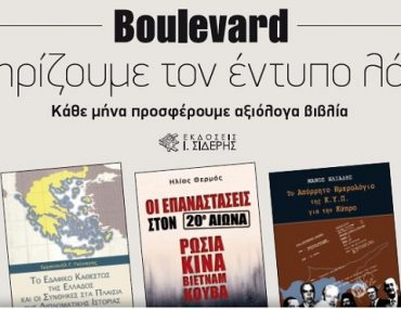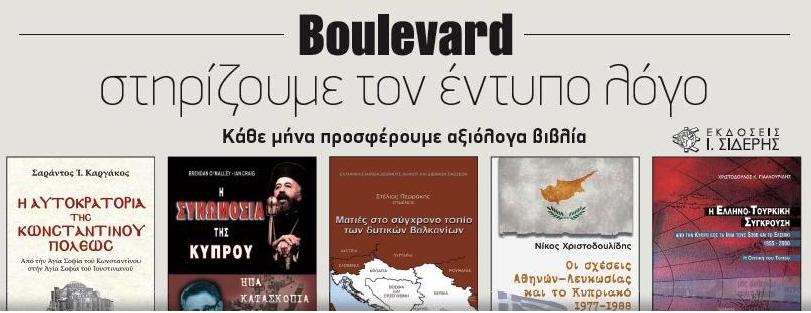 Η “Boulevard” στηρίζοντας τον πολιτισμό και δη τον έντυπο λόγο, προσφέρει κάθε μήνα αξιόλογα βιβλία, με την ευγενική χορηγία και σύμπραξη των σημαντικότερων και μεγαλύτερων εκδοτικών οίκων της Ελλάδος.