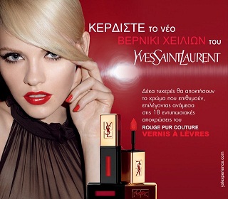 Το site του περιοδικού elle διοργανώνει διαγωνισμό και δίνει τη δυνατότητα σε 10 νικητές να κερδίσουν βερνίκια χειλιών Rouge Pur Coutoure, Vernis a Levres του Yves Saint Laurent, αξίας 28,62 Ευρώ/ έκαστο.