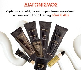 To Elle διοργανώνει διαγωνισμό και σας δίνει τη δυνατότητα να κερδίσετε ένα σετ περιποίησης προσώπου και σώματος Karin Herzog το οποίο περιλαμβάνει 8 προϊόντα συνολικής αξίας 405 Ευρώ, ήτοι: 1 αντιρυτιδική κρέμα προσώπου Vita–A-Kombi 1, 1 τζέλ καθαρισμού προσώπου Finest Chocolate Cleansing, 1 Ορό αντιγύρανσης Erase & Raise, 1 κρέμα σώματος με συσφιγκτική δράση Tonus B12, 1 κρέμα σώματος για λάμψη Body Shimmer, 1 Αφρόλουτρο με απολεπιστικές ιδιότητες Shower Body Scrub, 1 κρέμα σώματος κατά της κυτταρίτιδας Silhouette, 1 κρέμα ματιών Decongest.