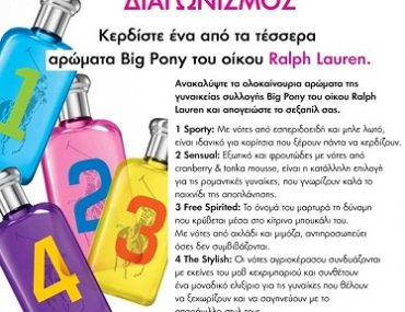 Το Elle διοργανώνει διαγωνισμό και σας δίνει τη δυνατότητα να κερδίσετε 4 ΔΙΑΦΟΡΕΤΙΚΑ αρώματα Big Poly του Ralph Lauren (BIG PONY 1 SPORTY, BIG PONY 2 SENSUAL, BIG PONY 3 FREE SPIRITED, BIG PONY 4 STYLISH).