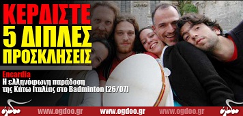 Το Ogdoo.gr εξασφάλισε για τους αναγνώστες του πέντε διπλές προσκλήσεις για τη μουσική παράσταση των Encardia, στο μουσικό προαύλιο του Badminton, την Πέμπτη 26 Ιουλίου.