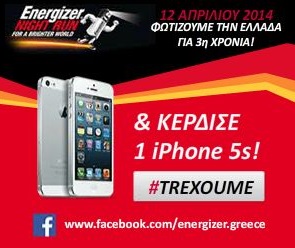 Ο 3ος νυχτερινός αγώνας Energizer Nightrun είναι γεγονός! Εσύ μην κάθεσαι! Τρέξε στο Super Market και βρες τα νέα ειδικά stand της Energizer, γράψε τον μυστικό κωδικό, φώτισε όλη την Ελλάδα και κέρδισε 1 iPhone 5s!