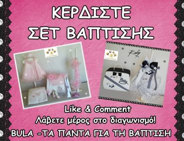 Η εταιρία BULA, διοργανώνει διαγωνισμό και σας δίνει την ευκαιρία να κερδίστε ένα σετ βάπτισης, τ’ οποίο αποτελείται από ξύλινο κουτί βάπτισης, λαμπάδα βάπτισης, μαρτυρικά 1 σετ(50 τεμάχια), μπουκαλάκι , σαπουνάκι και 3 κεράκια κολυμπήθρας, για αγοράκι ή κοριτσάκι!