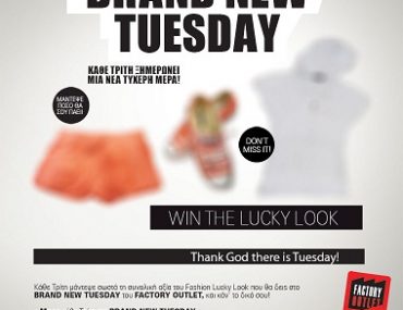 Κάθε Τρίτη είναι η τυχερή σας μέρα! Μπείτε στη σελίδα του Factory Outlet στο facebook και παίξτε Βrand New Tuesday. Μαντέψτε σωστά τη συνολική αξία του Fashion Lucky Look που θα δείτε στο Βrand New Tuesday του Factory Outlet και κάντε το δικό σας.