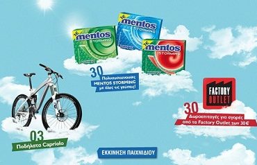 Η σελίδα Mentos Greece διοργανώνει διαγωνισμό και σας δίνει τη δυνατότητα να κερδίσετε κάθε εβδομάδα 1 ποδήλατο μάρκας Capriolo, 10 δωροεπιταγές αξίας 30€ από τα Factory Outlet και 10 πολυσυσκευασίες mentos storming με όλες τις γεύσεις.