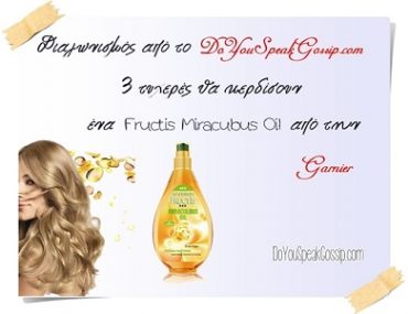 Το DoYouSpeakGossip.com, διοργανώνει διαγωνισμό σε συνεργασία με την Garnier. 3 τυχερές θα έχουν την ευκαιρία να κερδίσουν από ένα Fructis Miraculous Oil για τα μαλλιά τους.