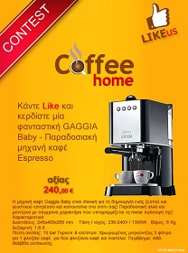 Η σελίδα του CoffeeHome στο Facebook διοργανώνει διαγωνισμό και σας δίνει τη δυνατότητα να κερδίσετε μια GAGGIA Baby – παραδοσιακή μηχανή καφέ Espresso αξίας 240,00€.