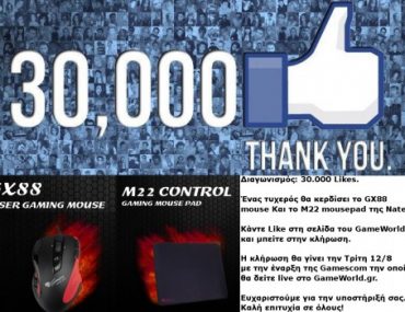 Το GameWorld έσπασε σήμερα το πρωί το φράγμα των 30.000 Likes στη Facebook Page και το γιορτάζει με έναν ακόμη διαγωνισμό. Η Natec χαρίζει το GX88 mouse και το M22 mousepad!