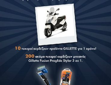 Η σελίδα Gillette διοργανώνει διαγωνισμό και δίνει τη δυνατότητα σε ένα τυχερό να κερδίσει ένα Scooter Piaggeo X7 EVO 125 και σε 10 ακόμα προϊόντα ξυρίσματος και περιποίησης της επιδερμίδας Gillette για ένα χρόνο.